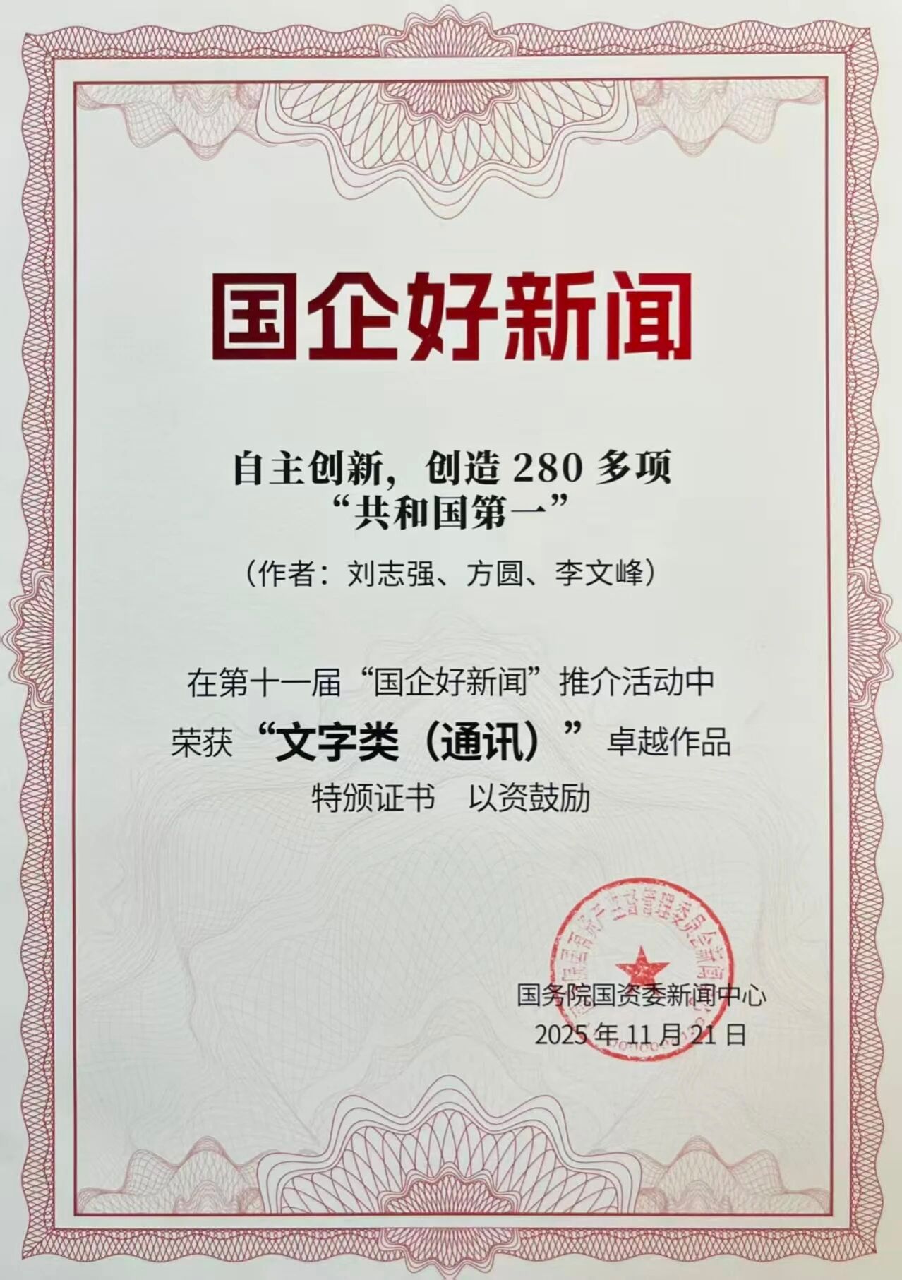 據(jù)了解,本次“國(guó)企好新聞”由國(guó)務(wù)院國(guó)資委宣傳局、中國(guó)記協(xié)國(guó)內(nèi)部指導(dǎo),國(guó)務(wù)院國(guó)資委新聞中心主辦,《國(guó)資報(bào)告》雜志社承辦,共征集作品8138件,邀請(qǐng)96位專家組成獨(dú)立的推介委員會(huì),涵蓋政企學(xué)研媒等各行業(yè),保證評(píng)選的專業(yè)性、全面性、權(quán)威性。