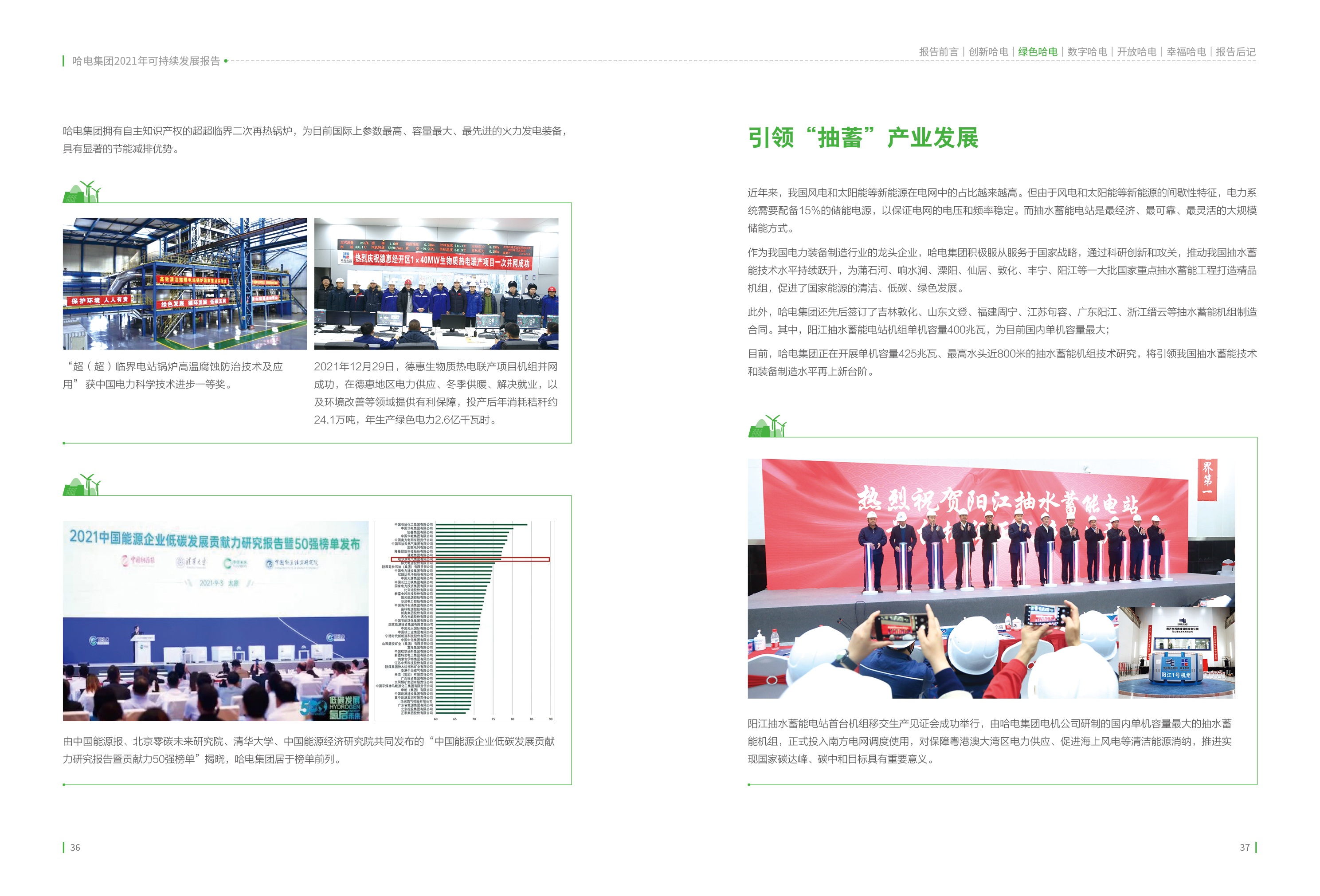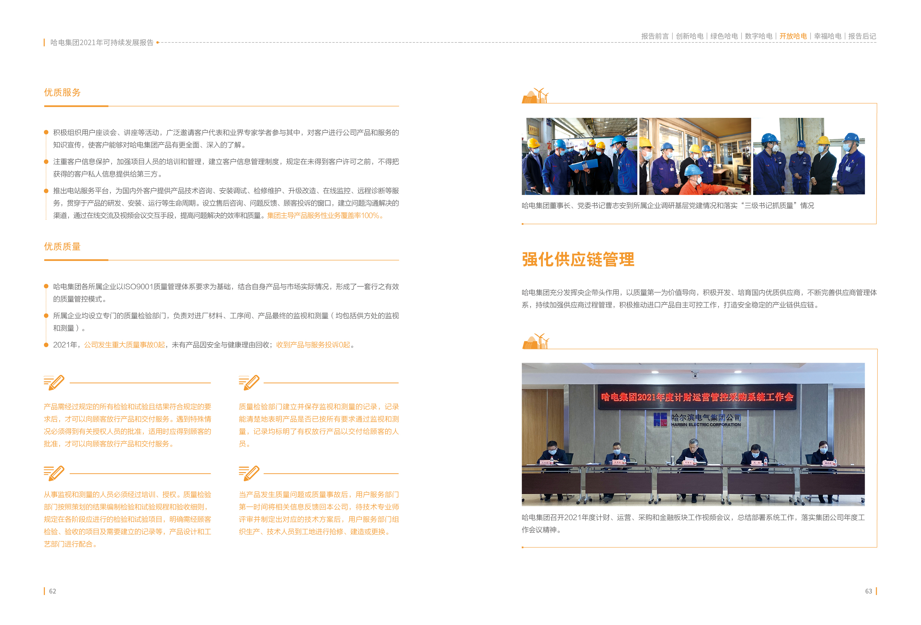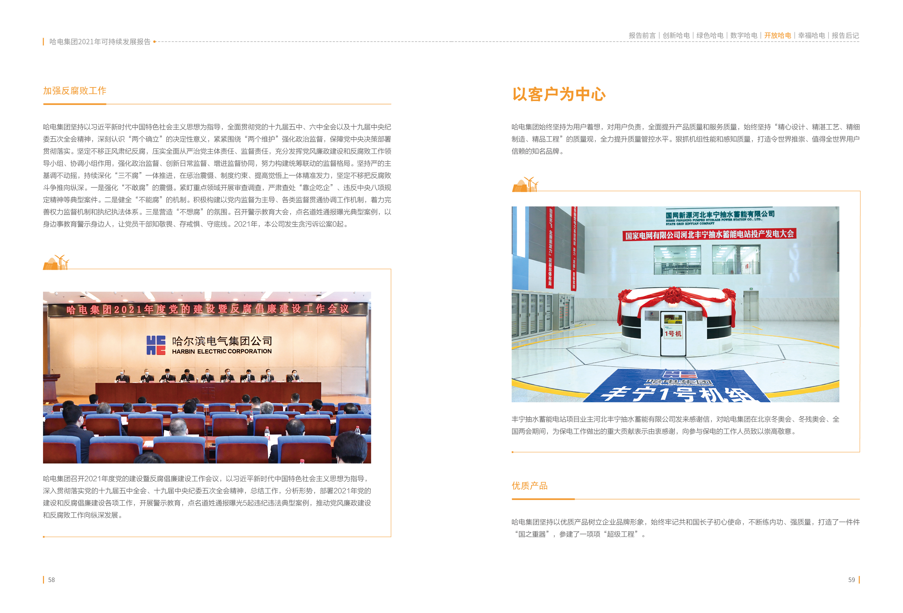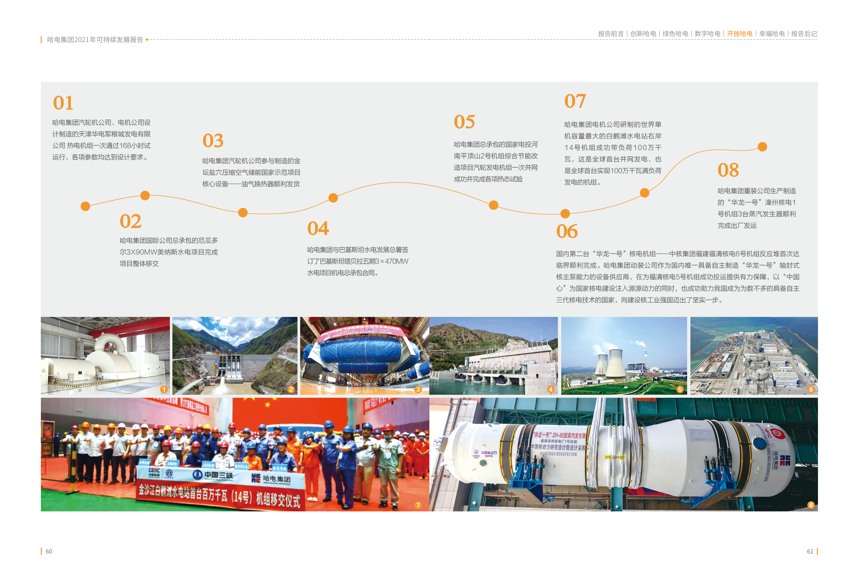 《哈電集團(tuán)2021年度可持續(xù)發(fā)展報(bào)告》以“創(chuàng)新哈電”、“綠色哈電”、“數(shù)字哈電”、“開放哈電”、“幸福哈電”為主體內(nèi)容,全面展現(xiàn)哈電集團(tuán)2021年在改革發(fā)展、客戶責(zé)任、貢獻(xiàn)社會(huì)、保護(hù)環(huán)境、愛護(hù)員工等方面取得的成績(jī)。通過“以高質(zhì)量黨建引領(lǐng)高質(zhì)量發(fā)展”、“70載書寫光榮與夢(mèng)想”、“白鶴亮翅盡展大國重器——為全面踐行‘雙碳’戰(zhàn)略目標(biāo)貢獻(xiàn)哈電力量”、“履行政治責(zé)任、助力鄉(xiāng)村振興”、“沉淀企業(yè)文化、凝練哈電精神”五個(gè)責(zé)任專題,聚焦哈電集團(tuán)在黨建引領(lǐng)、70年發(fā)展歷程、打造精品工程、助力鄉(xiāng)村振興、沉淀企業(yè)文化等領(lǐng)域的重點(diǎn)工作成效,彰顯了中央企業(yè)的責(zé)任擔(dān)當(dāng)。