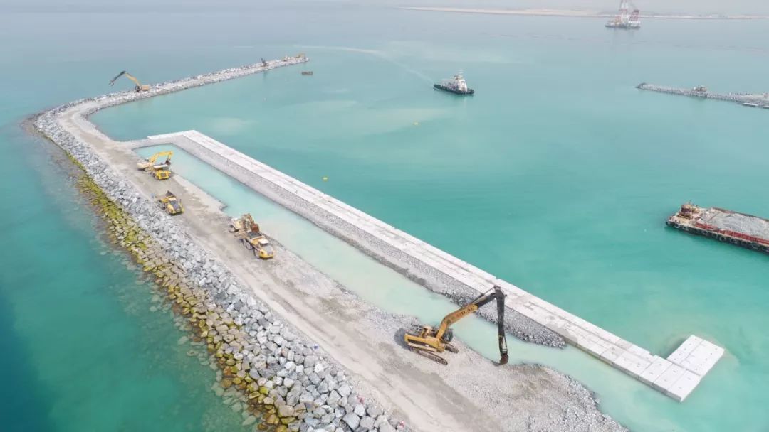 在水工結(jié)構(gòu)開工之前圍設(shè)防淤簾,其主要作用是形成一道防污屏障,用來阻隔和限制施工區(qū)域內(nèi)攪動的泥沙及產(chǎn)生的污染物向施工區(qū)域以外擴(kuò)散,從而確保施工區(qū)域周圍的水體不受污染;同時,防御簾還起到了阻攔海龜、海豚等海洋動物誤入施工區(qū)域的作用。從環(huán)保的角度來講,這些伸展在海面上醒目的橙紅色“防污染警戒線”,傳達(dá)了中國企業(yè)綠色環(huán)保理念的生態(tài)保護(hù)線。