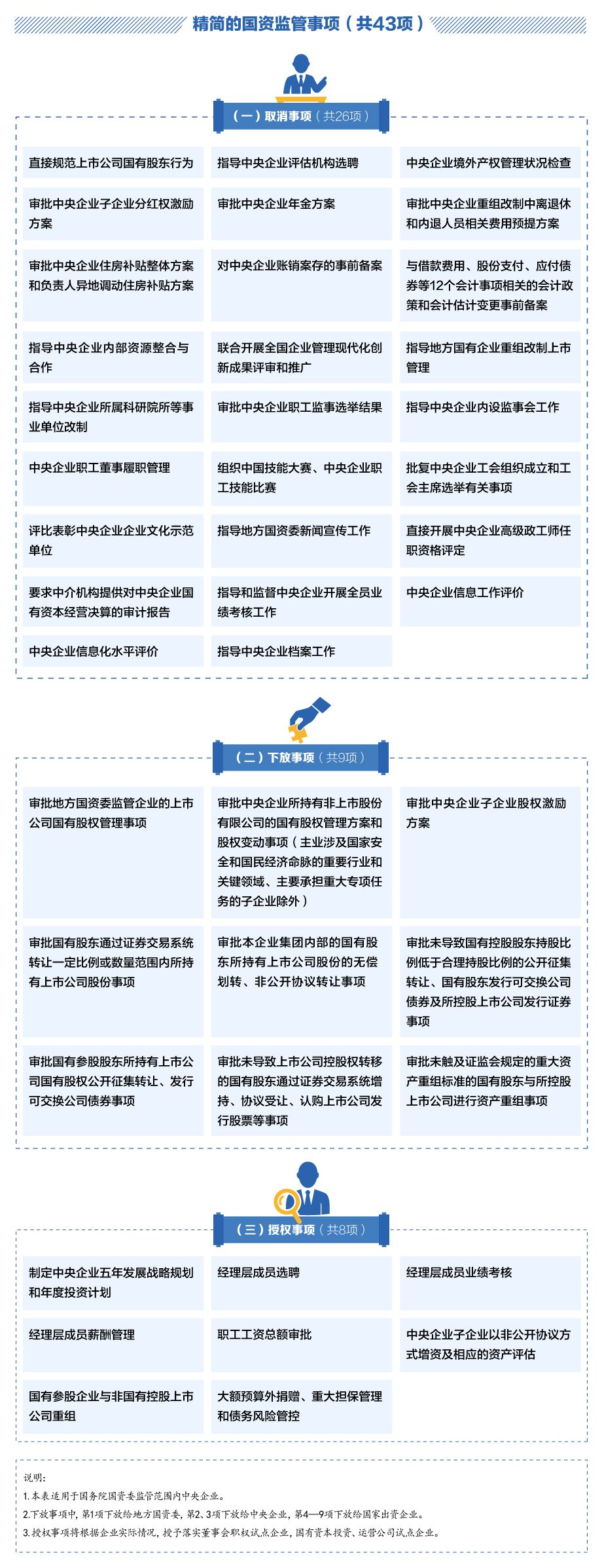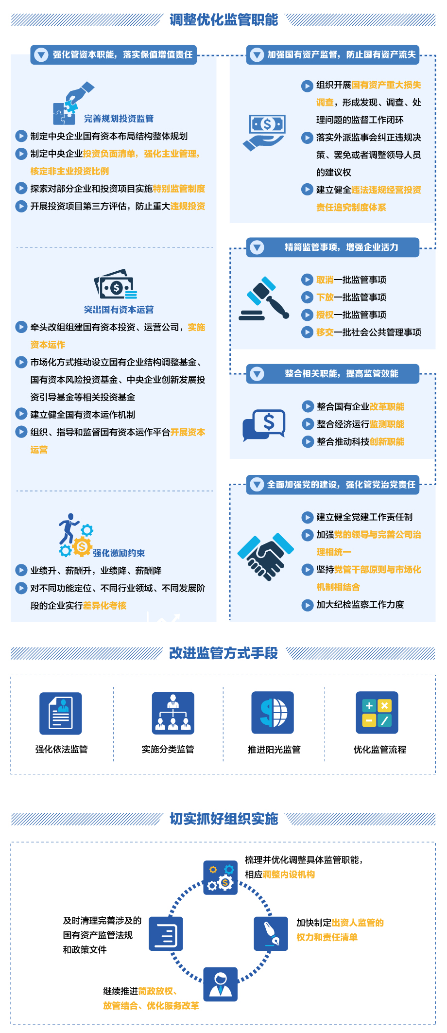 | 黨的十八大以來,國務(wù)院國資委認(rèn)真貫徹落實(shí)黨中央、國務(wù)院關(guān)于深化國有企業(yè)改革的決策部署,準(zhǔn)確把握國有資產(chǎn)監(jiān)管機(jī)構(gòu)的出資人代表職責(zé)定位,堅(jiān)定不移深化國有企業(yè)改革,探索完善國有資產(chǎn)監(jiān)管體制機(jī)制,積極推進(jìn)國有企業(yè)結(jié)構(gòu)調(diào)整、創(chuàng)新發(fā)展,為實(shí)現(xiàn)國有資產(chǎn)保值增值、防止國有資產(chǎn)流失、發(fā)展壯大國有經(jīng)濟(jì)作出了積極貢獻(xiàn)。但與此同時(shí),國有資產(chǎn)監(jiān)督機(jī)制尚不健全,國有資產(chǎn)監(jiān)管中越位、缺位、錯(cuò)位問題依然存在,亟需加快調(diào)整優(yōu)化監(jiān)管職能和方式,推進(jìn)國有資產(chǎn)監(jiān)管機(jī)構(gòu)職能轉(zhuǎn)變,進(jìn)一步提高國有資本運(yùn)營和配置效率。4月27日,國務(wù)院辦公廳轉(zhuǎn)發(fā)《國務(wù)院國資委以管資本為主推進(jìn)職能轉(zhuǎn)變方案》,明確提出調(diào)整優(yōu)化國資監(jiān)管職能,改進(jìn)監(jiān)管方式手段,著力提高國有資本效率,增強(qiáng)國有企業(yè)活力。文件還明確了精簡的國資監(jiān)管事項(xiàng)共43項(xiàng)。 |