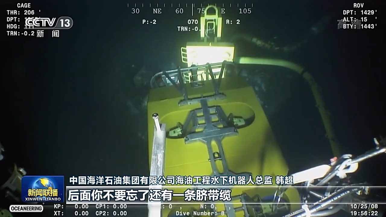 中國海洋石油集團有限公司海油工程水下機器人總監(jiān) 韓超:你的手腳要并用,然后你要在抓的同時,后面你不要忘了還有一條臍帶纜是連著你的。你再稍微一用力,那通訊要不然斷了,要不然就絕緣報警。