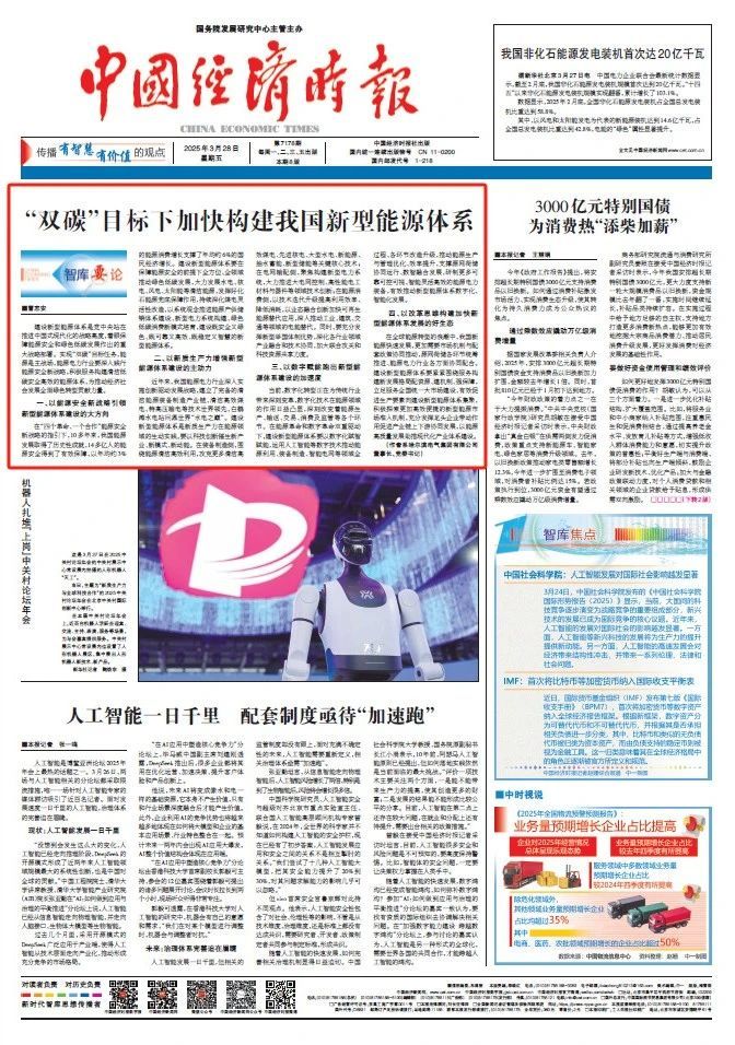 3月28日,國務(wù)院發(fā)展研究中心主管主辦的《中國經(jīng)濟時報》頭版頭條“智庫要論”專題刊發(fā)哈電集團董事長、黨委書記曹志安《“雙碳”目標(biāo)下加快構(gòu)建我國新型能源體系》一文。