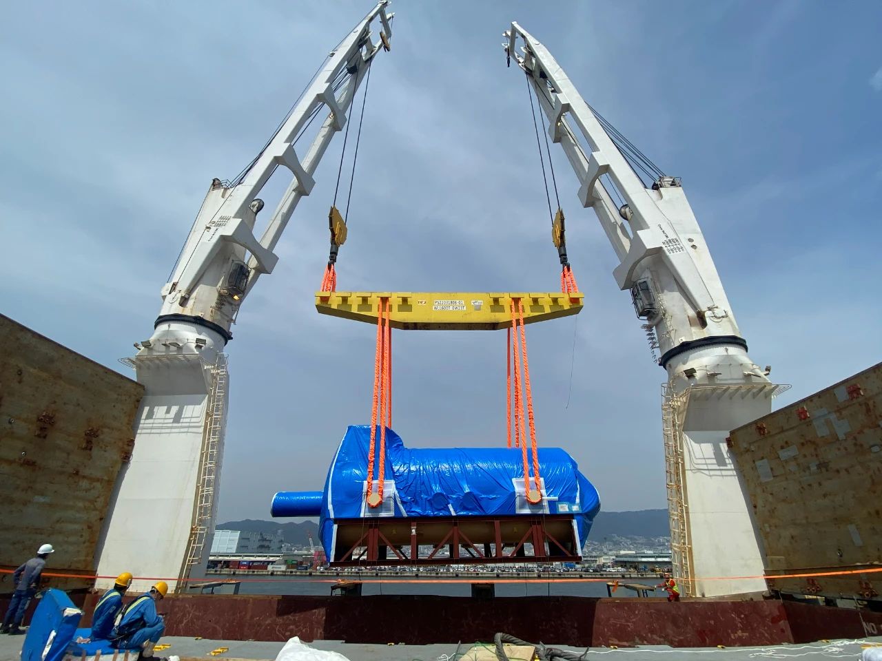 此次發(fā)運燃機重量達517噸,是哈電國際發(fā)運單體重量最大的設(shè)備,采用起吊能力達640噸的重吊船抬吊操作裝船。為確保操作過程絕對安全,哈電國際物流管理團隊在啟運前與物流分包商精心規(guī)劃操作方案,嚴(yán)格審核技術(shù)細節(jié),對設(shè)備包裝、吊點重心、結(jié)構(gòu)尺寸等細節(jié)與設(shè)備廠家充分交流,確保滿足核心設(shè)備裝船、綁扎、運輸過程的安全要求,同時積極協(xié)調(diào),跟蹤對接船、貨狀態(tài)。最終按照發(fā)運計劃和操作方案要求,順利完成裝船發(fā)運。