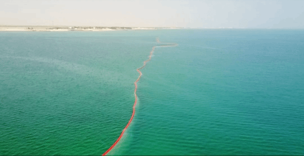為了確保施工區(qū)周邊的珊瑚、水草群落不會(huì)受到疏浚海底絞吸作業(yè)和沉淀池排水所潛在的不利影響,為了保護(hù)這塊海洋動(dòng)植物的圣地,哈電集團(tuán)聯(lián)合國(guó)際知名咨詢公司的環(huán)境專(zhuān)家,經(jīng)過(guò)反復(fù)研究論證,確定了保護(hù)水質(zhì)的最佳方案——“防淤簾防污方案”,構(gòu)筑起橙紅色“防污染警戒線”。