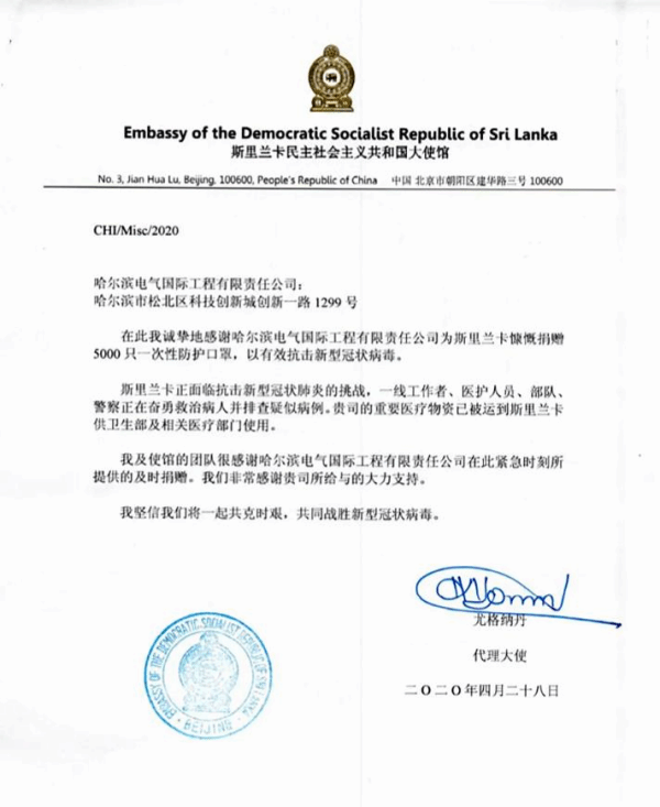 近日,哈電國際收到一封特殊的感謝信。這封感謝信來自斯里蘭卡民主社會主義共和國大使館,信中對哈電國際為斯里蘭卡抗擊疫情捐贈防護(hù)口罩致以誠摯感謝。