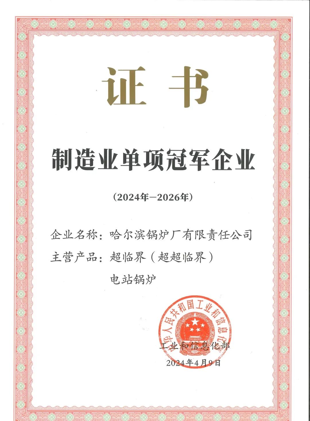 2024年,哈電集團(tuán)鍋爐公司超臨界(超超臨界)電站鍋爐榮獲制造業(yè)單項冠軍企業(yè)。