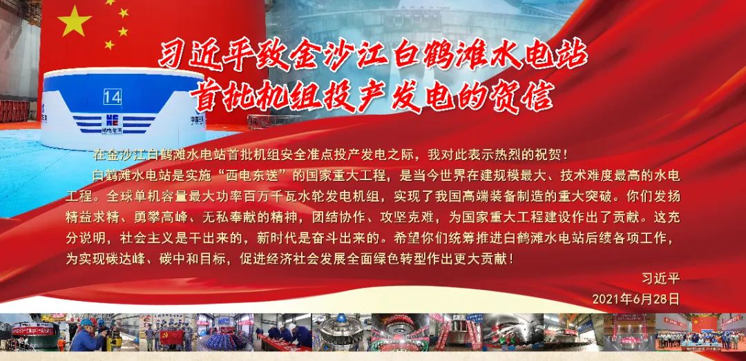2021年6月28日,金沙江白鶴灘水電站首批機(jī)組投產(chǎn)發(fā)電,中共中央總書記、國家主席、中央軍委主席習(xí)近平致信祝賀,寄語廣大項(xiàng)目建設(shè)者——統(tǒng)籌推進(jìn)白鶴灘水電站后續(xù)各項(xiàng)工作,為實(shí)現(xiàn)碳達(dá)峰、碳中和目標(biāo),促進(jìn)經(jīng)濟(jì)社會(huì)發(fā)展全面綠色轉(zhuǎn)型作出更大貢獻(xiàn)!