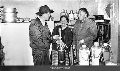 孔繁森向藏族同胞學(xué)習(xí)打酥油茶。(圖片由孔繁森同志紀(jì)念館提供)
