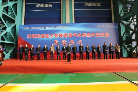 驗收會后,哈電集團黨委書記、董事長斯?jié)煞蚺c中國華能黨組成員、副總經(jīng)理葉向東共同為“大國重器”揭幕,各方代表分別致辭,對國家科技重大專項全球首臺高溫氣冷堆蒸汽發(fā)生器研制成功并順利通過驗收表示祝賀。